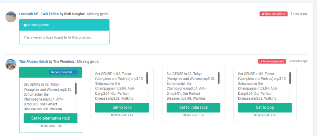 Finding lost artwork is only the beginning. You can apply rules to do such things as fix genre or sort out your folder structure. Fixes can be applied manually or automatically, as below: