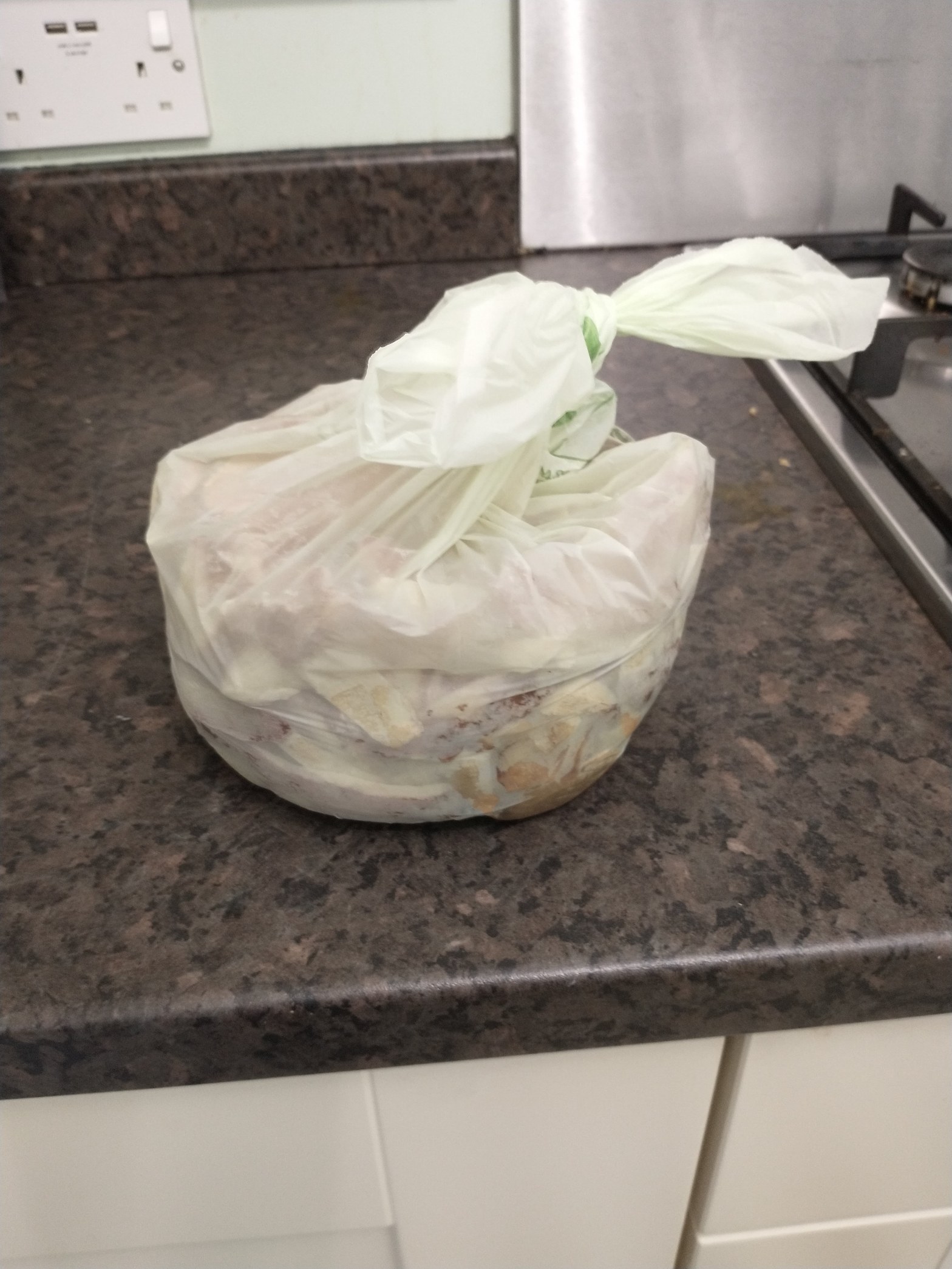 The green bag contains things like potato peelings and leftover scraps: the sort of things that can’t go on the compost heap. The green bag normally lives in a container. When the bag is full, it’s taken out to the green bin. Here, someone has taken it from the container and left it on the kitchen counter.